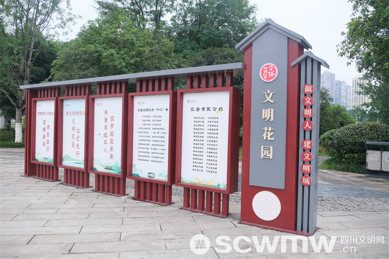位于两江公园内的“文明花园”,《江安市民公约》《江安文明行为“十二条”》以及道德模范、“最美”江安人先进事迹等展板一一呈现,络绎不绝的市民或细细品读,或轻声将典型故事讲给身旁的孩童听,或在一旁的“书香江安·文明里”书吧,享受阅读的乐趣。