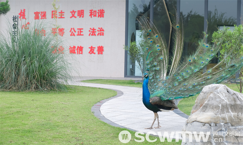 长江竹岛内孔雀开屏与社会主义核心价值观宣传标语。漆世平 摄