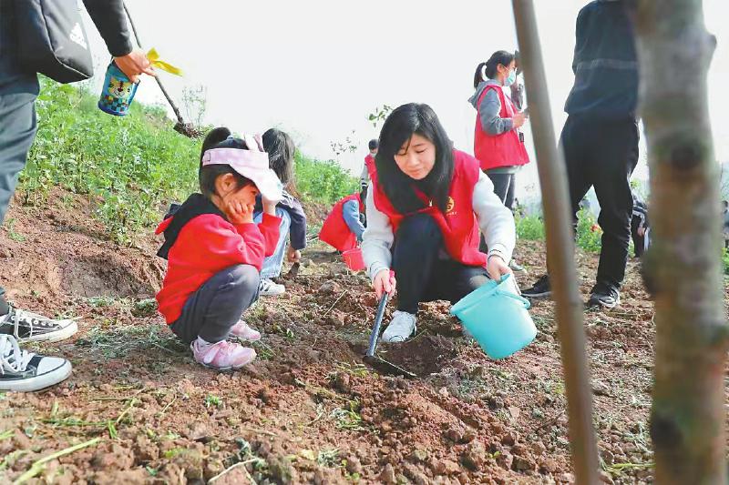 志愿者在植树的同时,也让孩子们感受志愿服务的氛围。
