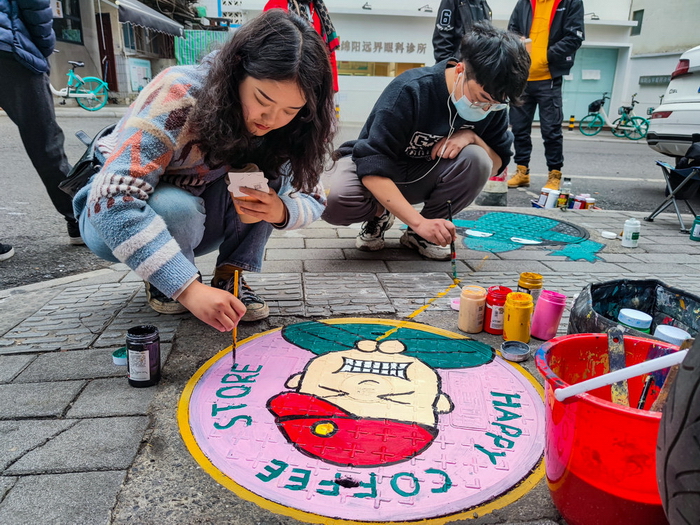 画师创意绘制,让井盖变“景”盖。图片来源:绵阳日报