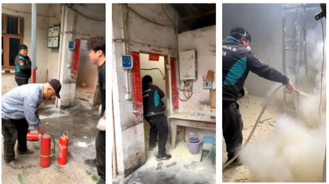 于是,大家都加入进来参与灭火,邻居帮忙传递灭火器,汽修店员工拨打119报警,还有人去负责拉闸断电……由于火势较大,曾小强多次拎着灭火器反复进入火场,用完了6个灭火器,火势仍没有得到控制。他们突然想到,汽修店内有个更大的灭火器,汽修店员工迅速返回店里去拿了过来,曾小强又戴上面罩,继续灭火。