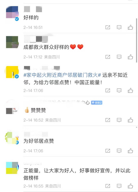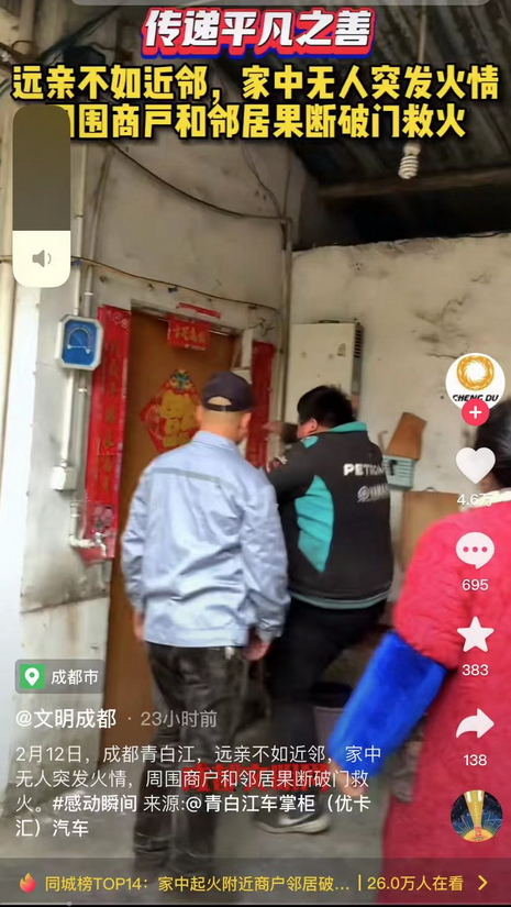 众人破门灭火的视频在网上迅速传播,成都人的友善互助更获得央视新闻等央媒的关注和报道,话题热度持续飙升。