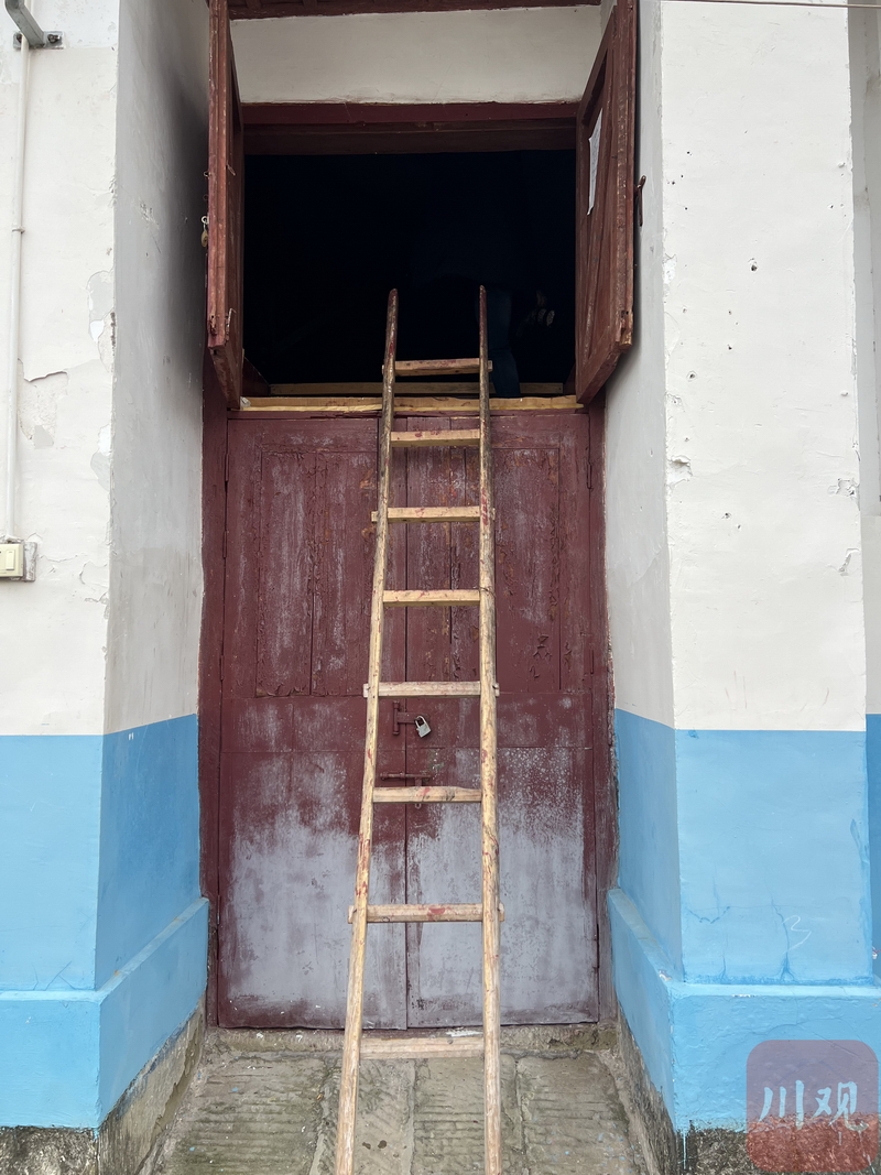 她熟练地爬上木梯,将仓库上层的锁和门打开,接着又走回库房扛出另一架5米多长的木梯,将木梯固定在仓库前两个凹槽里,再次爬上,进入仓库,开始一天的工作。