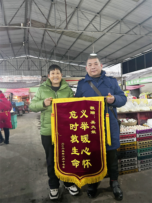 这名商贩姓曹,一直在白莲池街道菜市场卖豆腐。2月21日,当吴永秀再次来到菜市场时,曹先生拉着她的手连声感谢,并将一面写有“义举暖心怀 危时救生命”10个大字的锦旗送到她的手中,以感谢她的救命之恩。