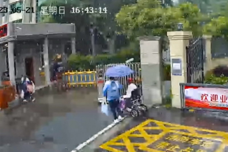 小区监控视频里胡佩君为老人撑伞的截图