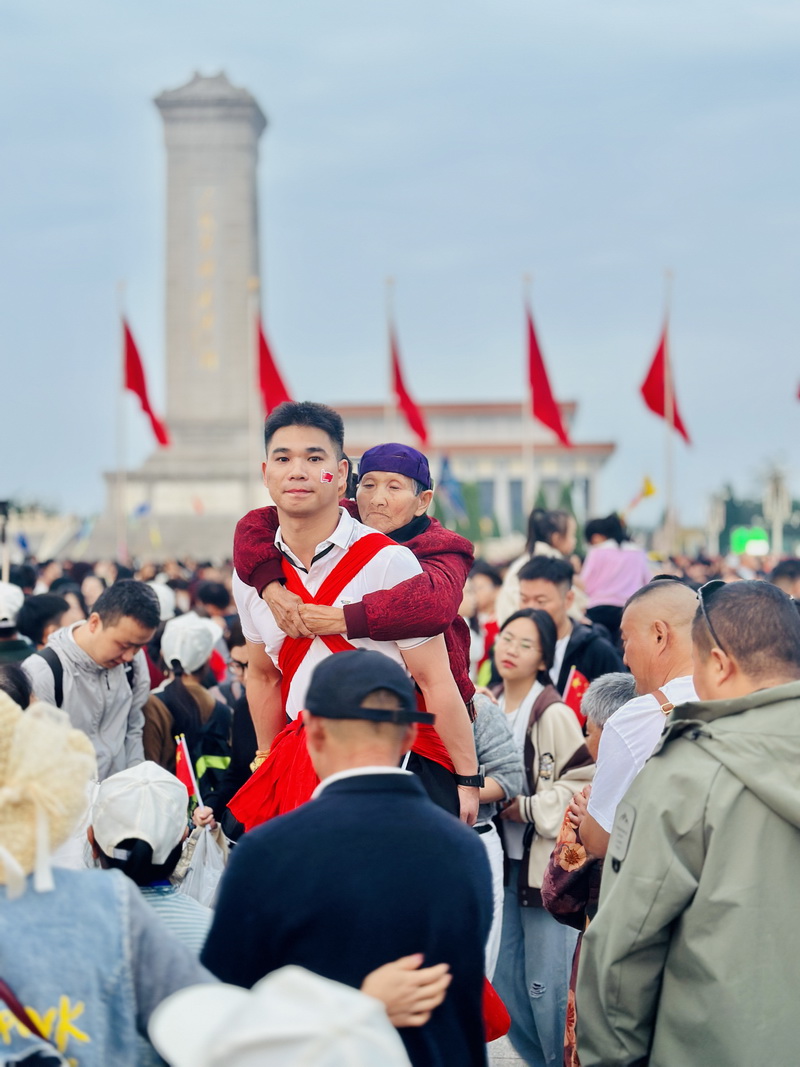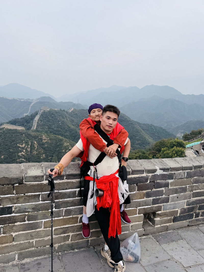 10月4日,他带着母亲前往八达岭长城。抵达八达岭寄存轮椅后,他用红绸带背起体重100多斤的母亲,一路攀登、走走停停,背带上“带母亲看北京”的字样在人群中格外醒目。“上次背妈妈爬剑门关总有人问身份,这样就能减少解释,保存精力专心照顾妈妈。”他解释道。