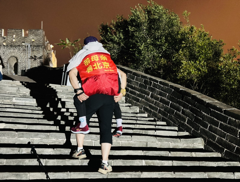 谭卫民背着母亲攀登夜长城的南四楼。受访者供图