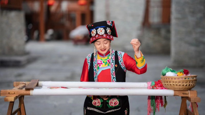 在陈云珍的工位旁,绣娘宋琴正俯身于绣架前,专注地绣制一幅双面绣屏风。宋琴曾因地震失去双腿,5年前来到羌绣工坊后,在陈云珍手把手的教导下,如今已成长为工坊里独当一面的业务能手。“这里早就是我的第二个家了。”宋琴笑着说,“靠着这门手艺,大多数时候每月能稳定增收2000多元。”