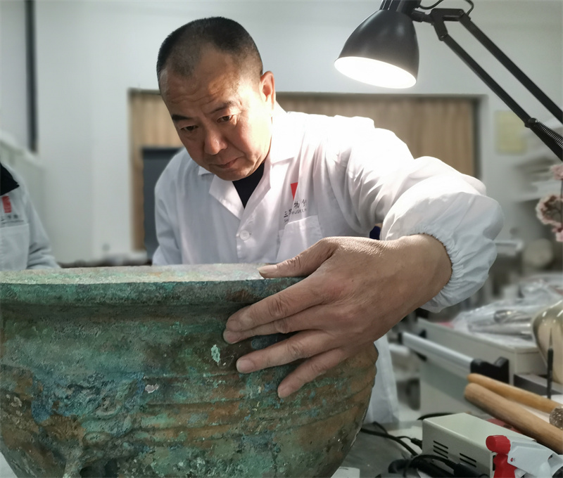 郭汉中为一个汉代青铜器”诊断“。(罗园 摄)