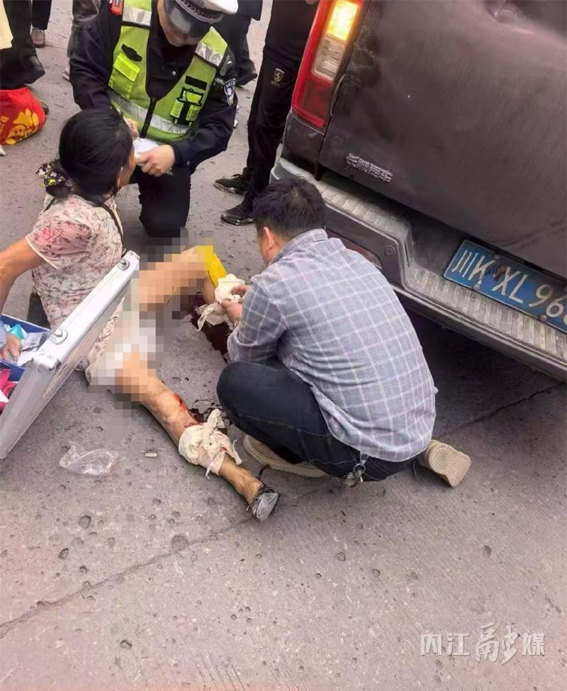 当天下午,李旻鹏因车辆轮胎出现故障,驱车前往威远县城红旗仓路的汽车维修店处理。车辆刚停稳,就有市民急切告知,附近路口发生交通事故,有人受伤。李旻鹏立即拨开围观人群,只见一名女性市民被车辆撞倒在地,腿部变形(系骨折典型症状),伤口流血不止,情况十分危急。