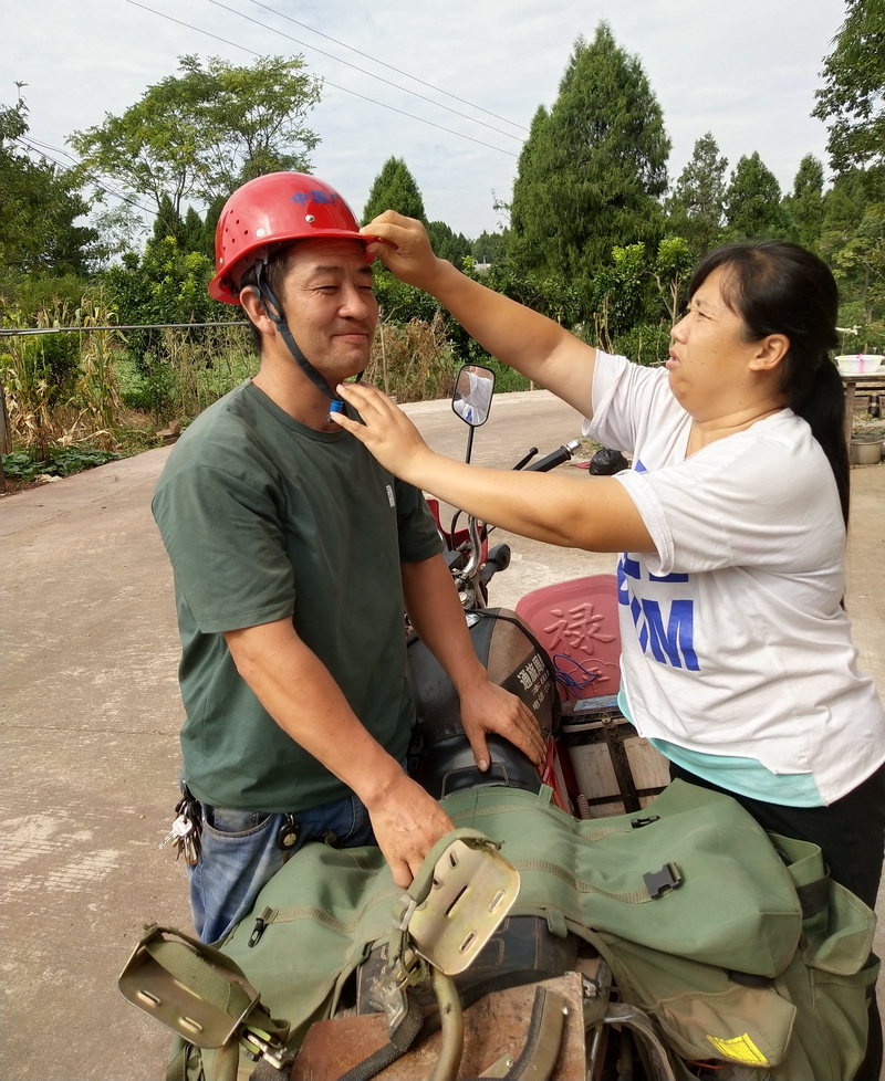 妻子刘红艳为准备外出的罗政带安全帽。