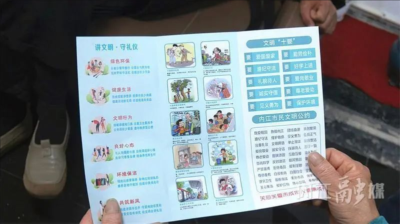 下午4时许,市中区民族路上人来人往,内江市中医医院的文明实践志愿者在此开展的志愿服务活动也如火如荼。在街边一家商铺前,文明实践志愿者卢永华正将文明市民手册递到商家手中。“老板,请看一下这份文明市民手册,里面有文明行为规范、文明‘十要’,还有内江市民文明公约,了解一下对共建咱们美丽内江很有帮助。”手册上清晰罗列着不要随地吐痰、不要闯红灯、不要乱扔垃圾等文明准则,让商家和过往市民能直观学习文明知识。