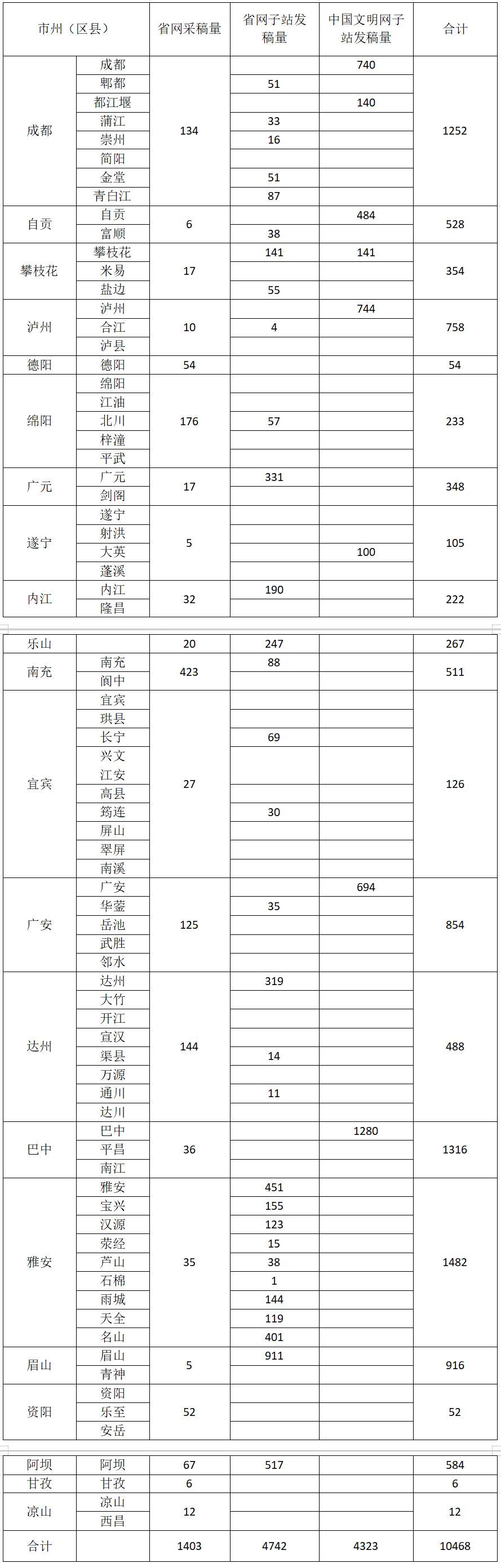 现将四川文明网采用的各市州稿件情况及各市州子站发稿量公布如下: