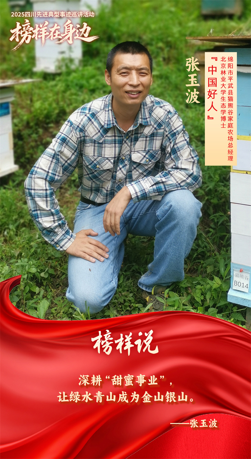 张玉波,“中国好人”、“四川好人”、绵阳市平武县猫熊谷家庭农场总经理。为守护大熊猫家园、帮助村民致富,2019年他辞去中国环境科学研究院优渥的工作,在平武县创立“猫熊谷家庭农场”,创新研发太阳能物联网格子蜂箱,实现远程监控、智能管理,大幅提高蜂群存活率和蜂蜜产量。他还在村里办“坝坝课堂”,翻山越岭现场指导,累计培训蜂农500多人,带动村民增收300多万元。