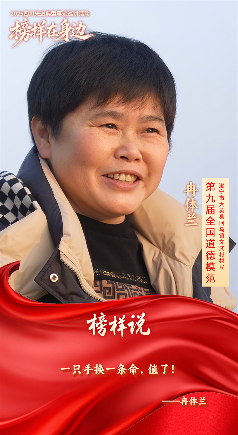 冉体兰,第九届全国道德模范、第八届四川省道德模范、遂宁市大英县回马镇文武村村民。2022年10月2日下午,在247国道回马镇段,冉体兰与邻居聊天时,余光瞥见两岁男童冲向马路中央,不远处一辆满载砂石的大货车呼啸而来。她立刻冲上前,左手死死拽住孩子棉袄后领往怀里抱,瞬间被货车保险杠撞上左肩,像断线风筝般摔出,左臂被车轮碾过,鲜血浸透衣衫。苏醒后发现左臂已截肢,这位坚强的妇女虽因恐惧痛哭,却坚定表示“一只手换一条命,值了”。
