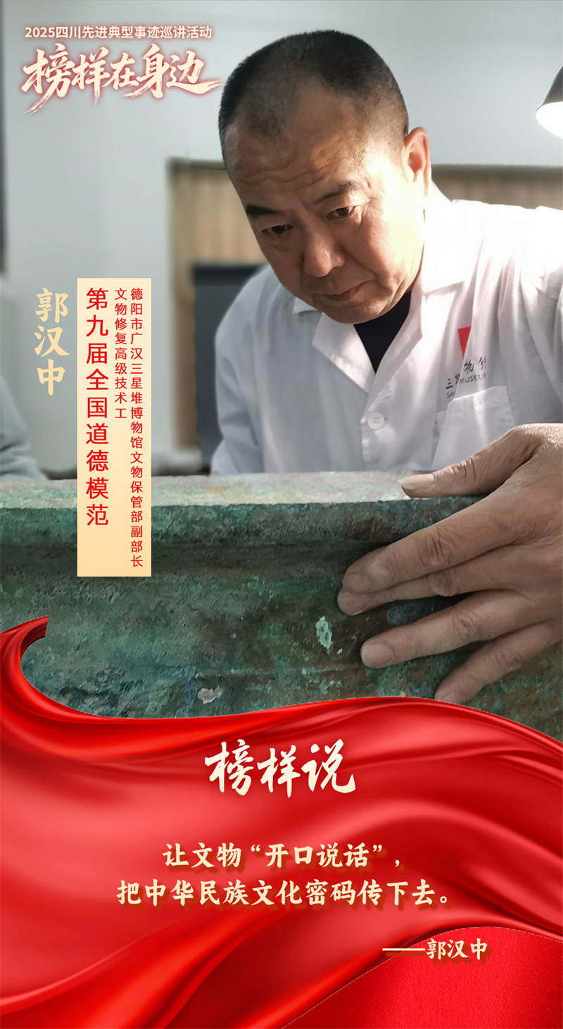郭汉中,第九届全国道德模范、第八届四川省道德模范、德阳市广汉三星堆博物馆文物保管部副部长、文物修复高级技术工,从事文物修复工作38年,修复6000余件文物,“重现”华夏辉煌古蜀文明。