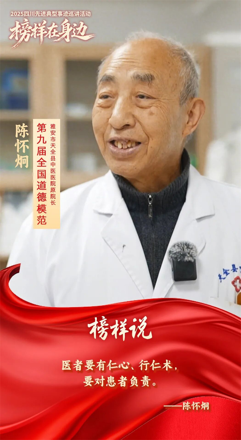陈怀炯,第九届全国道德模范、第三届四川省道德模范、雅安市天全县中医医院原院长,81岁高龄仍坚守医疗岗位,被群众亲切称为“大先生”。