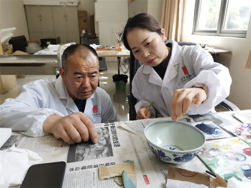 郭汉中指导徒弟王荔修复一只清代的陶瓷碗。罗园 摄