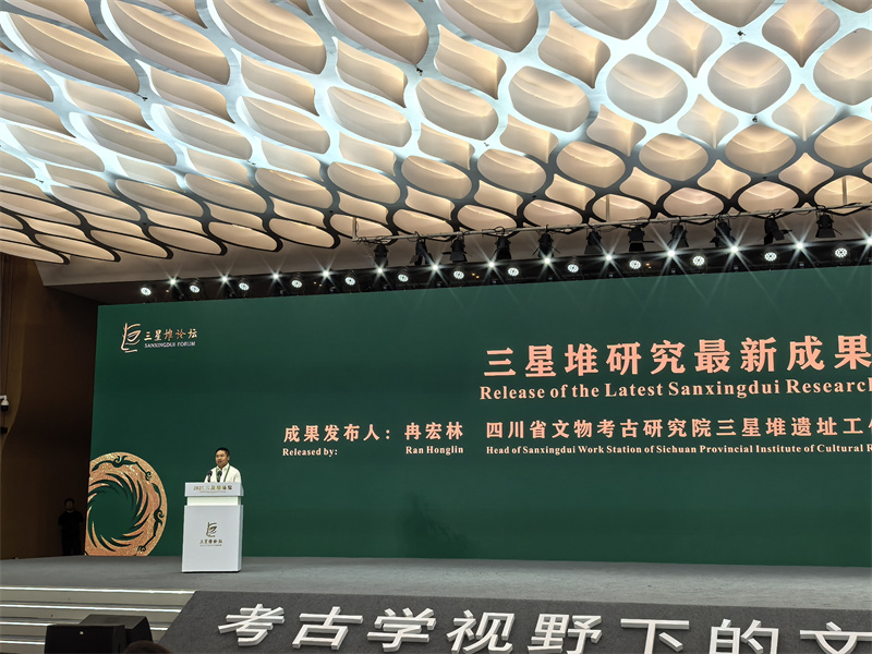 四川省文物考古研究院三星堆遗址工作站站长、三星堆博物馆副馆长冉宏林发布三星堆最新研究成果。(罗园 摄)