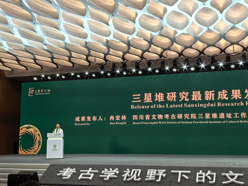 四川省文物考古研究院三星堆遗址工作站站长、三星堆博物馆副馆长冉宏林发布三星堆最新研究成果。(罗园 摄)