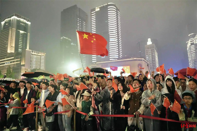 10月1日清晨,下着雨的成都有些许微凉,凌晨5点多,天府广场已经挤满了前来观看升国旗仪式的市民。他们举着国旗、拿着手机,与亲朋分享着激动之情。