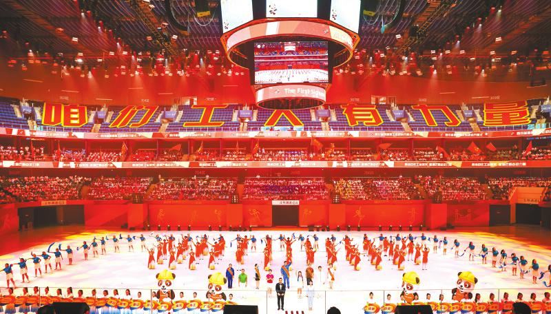 “咱们工人有力量,每天每日工作忙……”开幕式现场,《咱们工人有力量》《团结就是力量》《歌唱祖国》等激昂旋律接连响起,全场职工齐声高歌,“四川职工雄起”的呐喊响彻场馆。