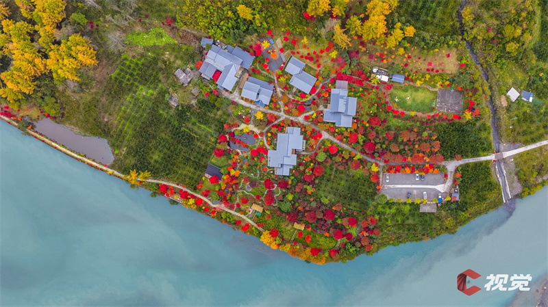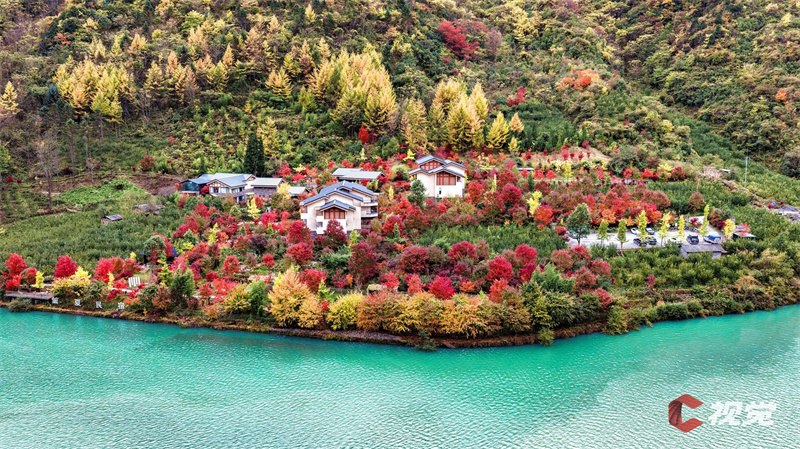 11月3日,阿坝州汶川县卧龙镇甘海子宛如一幅浓墨重彩的油画,两岸山林红枫似火、黄栌如金、层林尽染。C视觉签约摄影师 李旭 摄