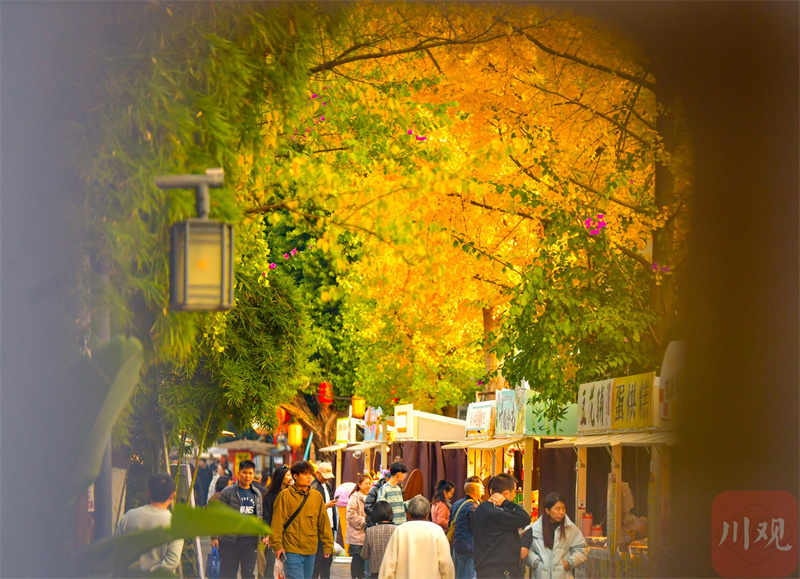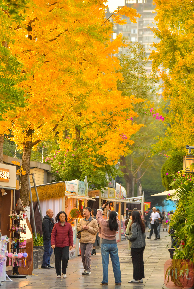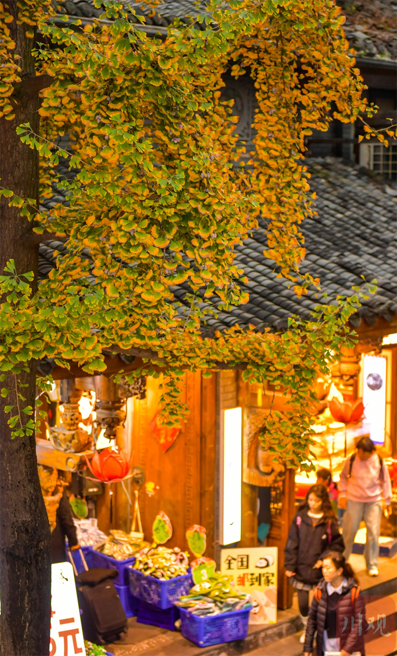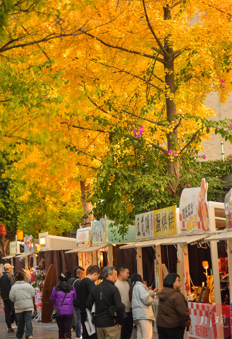 初冬时节,宽窄巷子的银杏树都换上了金黄色外衣,将屋檐和街道装扮得如诗如画。在古旧墙壁的映衬下,银杏叶带来温暖的色调,与古街巷、老建筑相映成趣,构成一幅诗意的初冬画卷,吸引了众多市民和游客前来休闲打卡、共享赏“金”之约,感受诗与浪漫。(四川在线记者 李向雨)