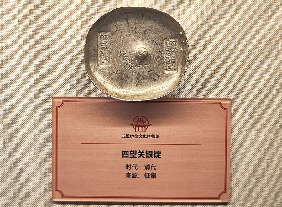 博物馆负责人乐军晏指着展柜里的一块银锭如数家珍:“这是清代的‘四望关银锭’。在中国古代,盐税是非常重要的财政收入。明清时期在五通桥四望关设立了盐政机构,银锭上的‘四望关’字样,就是标注这是在五通桥收取的盐税,熔铸成银锭。”