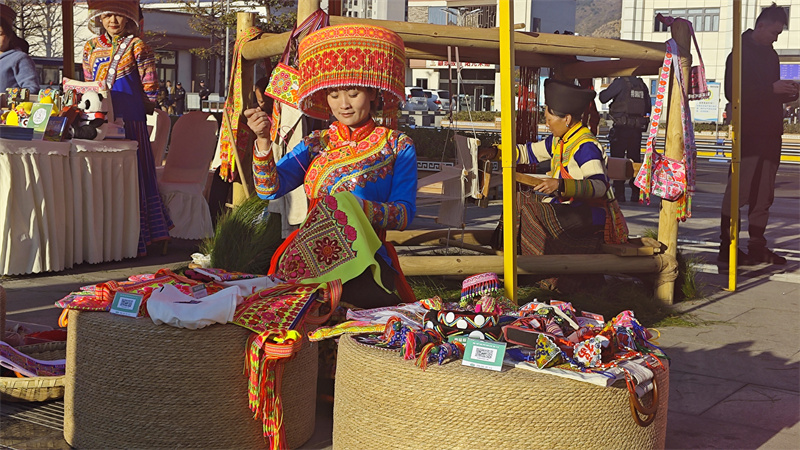 2月9日,米易东站站前广场,傈僳族姑娘展示刺绣技巧。 卢瑶 摄