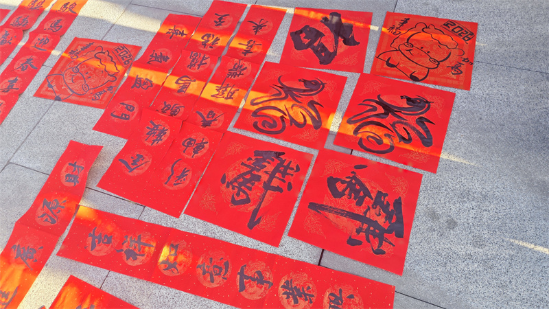 2月9日,米易东站站前广场,书法家书写了多样式的春联和“福”字供群众选择。 卢瑶 摄