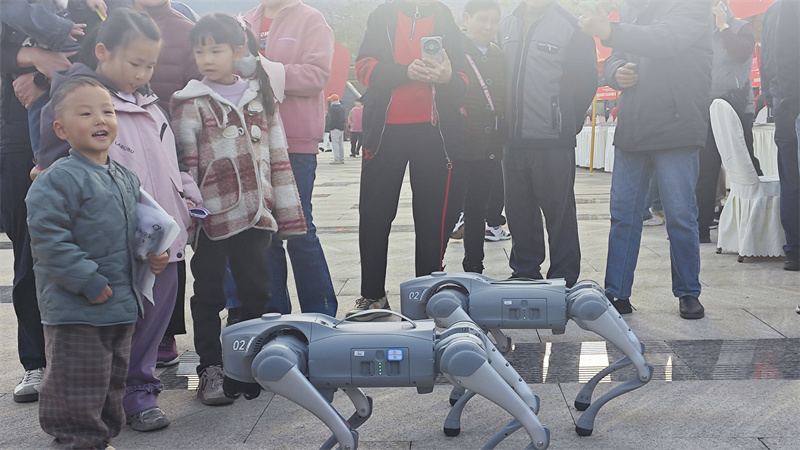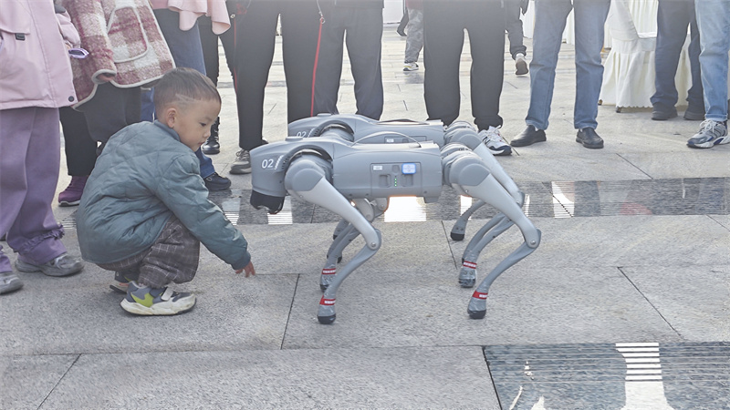 2月9日,米易东站站前广场,机器狗成小朋友“爱宠”。 卢瑶 摄