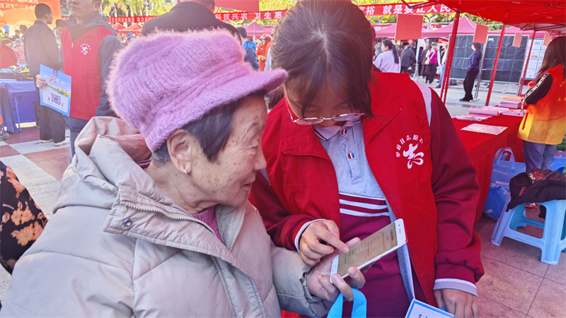 2月10日,攀枝花市仁和文化广场,志愿者正耐心指导群众在手机上答题。 卢瑶 摄