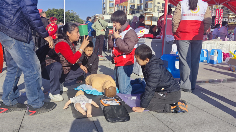 2月11日,盐边县昌意广场上,盐边县红十字会工作人员正在普及急救知识。 卢瑶 摄