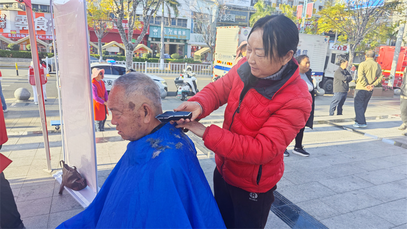 2月11日,盐边县昌意广场上,志愿者正在为群众无偿理发。 卢瑶 摄