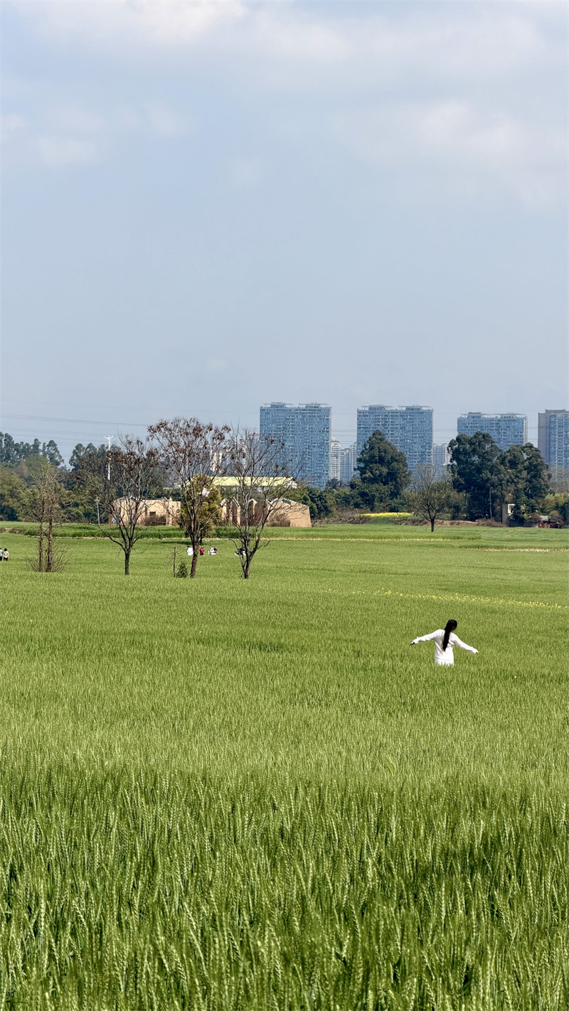 3月4日,成都天朗气清,许多年轻人奔着麦田而去。