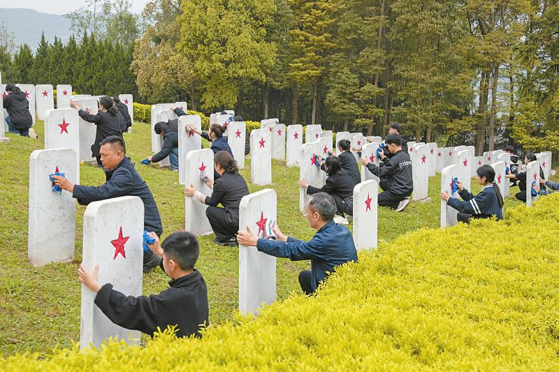 4月5日,清明节,巴中市通江县川陕革命根据地红军烈士陵园,家长带着孩子在无名烈士纪念园擦拭墓碑,缅怀革命先烈。程聪 摄(C视觉)