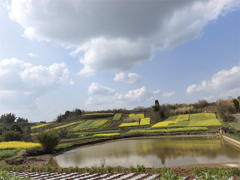 四川省内江市高新区高桥街道谢冲村里的油菜花田。(罗园 摄)