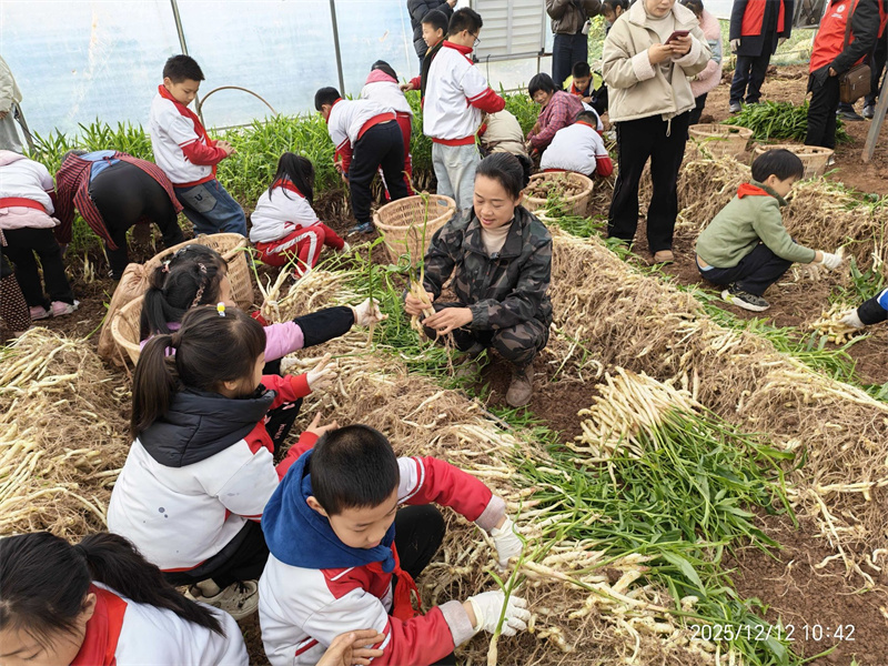 在四川省内江市威远县新店镇民富村,中国好人、村党总支书记刘红(右)组织当地青少年参加助农采姜文明实践志愿服务活动。(受访者供图)
