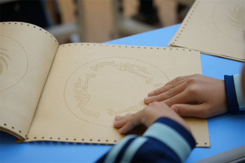“触摸金沙·感知金沙·体验金沙”课程:学生阅读盲文导览册(成都金沙遗址博物馆 供图)
