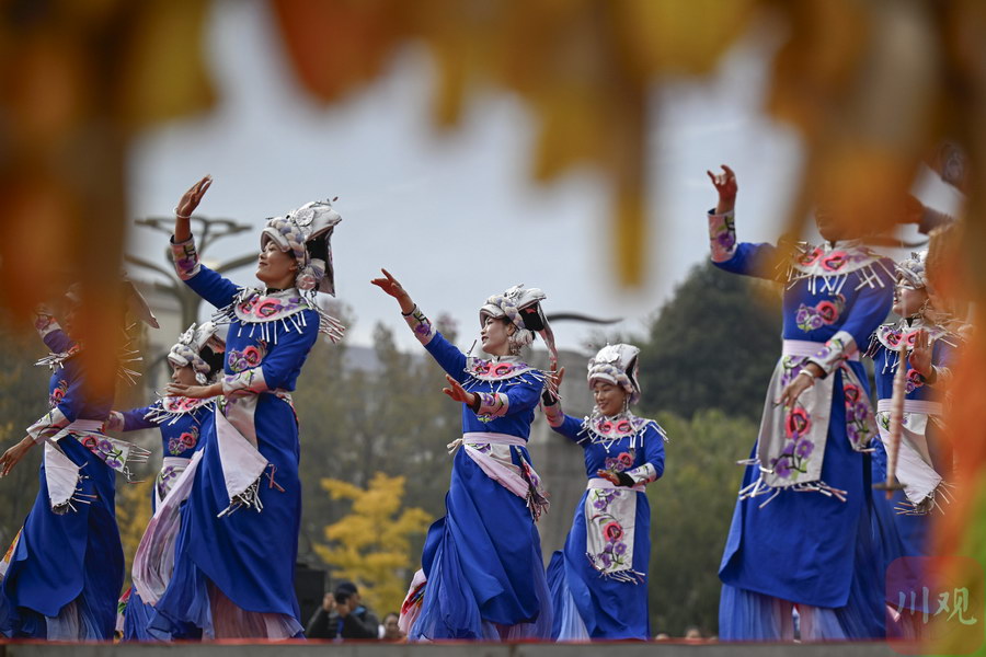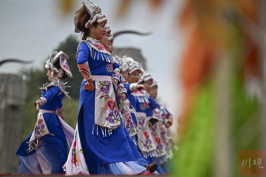 演员们正在进行羌族歌舞表演。