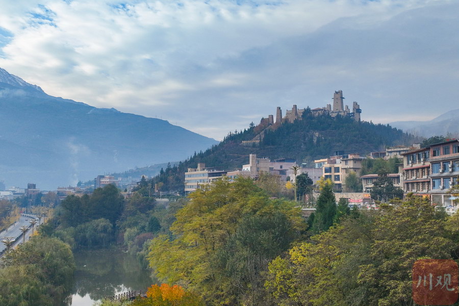 远处的羌碉与羌族歌曲表演相映成趣。