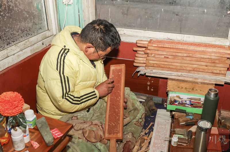 54岁的非遗代表性传承人扎多从事雕版制作已有三十余年。除了复刻雕版外,他还在传习所里带教,两项工作加起来年收入超十万元。