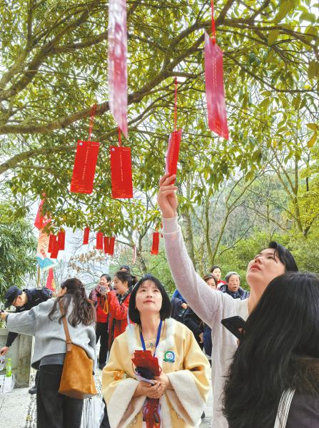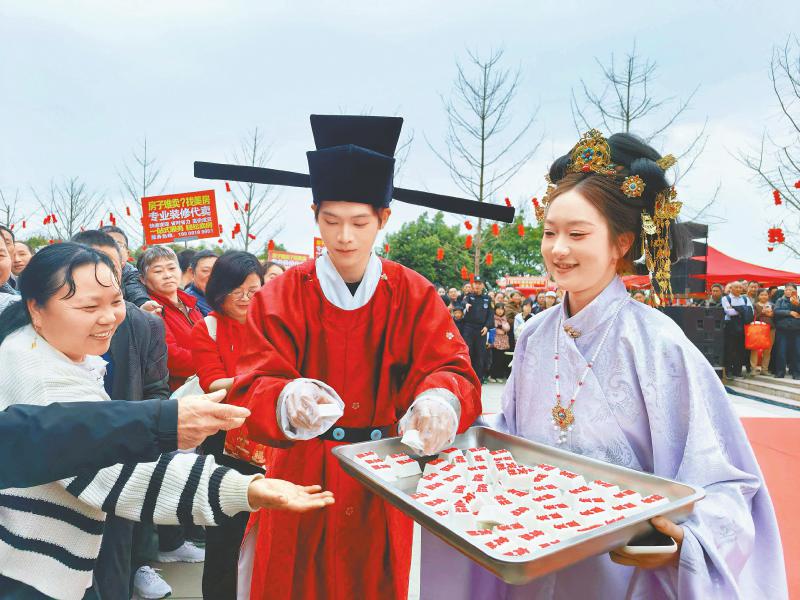 山顶的凤凰楼广场,“登高之约 五福之喜”沉浸式体验区更是吸引不少市民停留,文艺纳福、趣玩沾福、市集聚福、美食添福等板块依次铺开,龙狮腾跃、民俗歌舞轮番上演,摸福字、猜灯谜等传统游戏前排起长队。