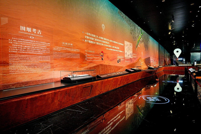一展厅以“水落银出”为主题,重点展示了江口古战场遗址的发现过程、围堰考古的创新举措,并真实还原了考古工作场景。展厅内,大量钱币散落陈列,模拟出当年江底文物堆积的震撼景象。此外,多媒体交互体验与考古工作车的实景还原,让人们更身临其境的参观感受,仿佛置身于考古发掘一线。
