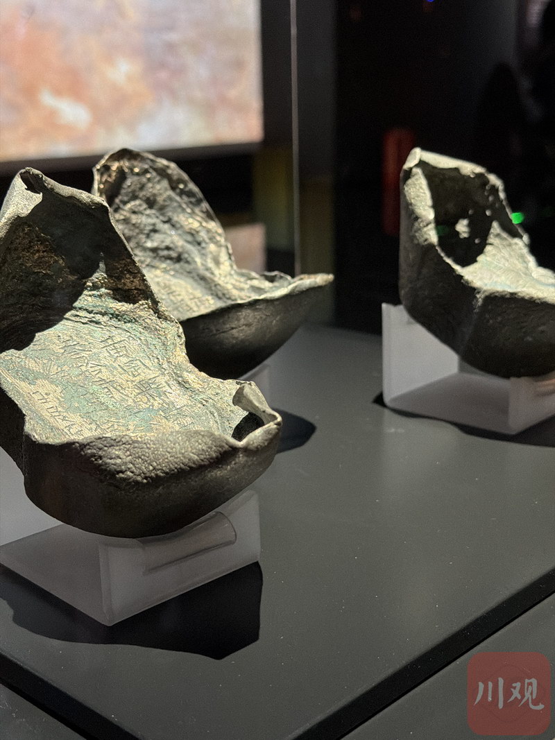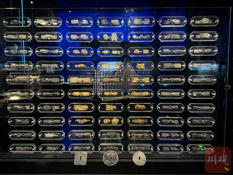 二展厅“沉银解谜”展出了不少馆内珍藏。除了大量铜钱、金银扣、金银戒、金帽顶、金梁冠外,还有大量金银锭。其中,就有镇馆之宝之一的“永昌大元帅印”,虎钮造型矫健,还有含金量高达95%的“蜀世子宝”、馆内唯一一件“足金五十两”金锭等。