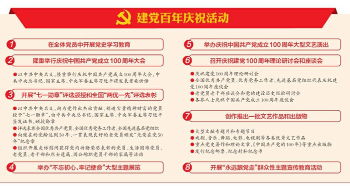 据了解,庆祝活动主要包括:一是结合巩固深化“不忘初心、牢记使命”主题教育成果,在全体党员中开展党史学习教育。二是以中共中央名义,隆重举行庆祝中国共产党成立100周年大会,中共中央总书记、国家主席、中央军委主席习近平将发表重要讲话。三是以中共中央名义,向为党作出杰出贡献、创造宝贵精神财富的党员授予“七一勋章”,由中共中央总书记、国家主席、中央军委主席习近平签发证书,颁授勋章;评选表彰全国优秀共产党员、全国优秀党务工作者、全国先进基层党组织;向健在的党龄达到50年、一贯表现良好的老党员颁发“光荣在党50年”纪念章;组织开展走访慰问获得党内功勋荣誉表彰的党员、生活困难党员、老党员、老干部和烈士遗属、因公殉职党员干部家属等活动。四是举办“不忘初心、牢记使命”大型主题展览,全面、系统、生动、立体地展示中国共产党百年的光辉历程、伟大成就和宝贵经验。五是举办庆祝中国共产党成立100周年大型文艺演出,邀请党和国家领导人、获得功勋荣誉表彰的代表、基层党员和群众代表等各界人士观看。六是中央宣传部将会同中央组织部、中央党校(国家行政学院)、中央党史和文献研究院、教育部、中国社会科学院、军委政治工作部联合召开庆祝建党100周年理论研讨会;中央组织部将召开全国优秀共产党员、优秀党务工作者、先进基层党组织代表庆祝建党100周年座谈会和老党员老干部座谈会、党的建设历史经验研讨会;中央统战部将商各民主党派中央、无党派人士和全国工商联,召开各界人士庆祝中国共产党成立100周年座谈会。七是以中国共产党成立100年来的光辉历史、伟大成就和宝贵经验,以及各个历史时期涌现出来的先进典型为主要内容,制作播出大型文献专题片和专题节目;创作推出一批具有较高思想艺术水平的戏剧、音乐、舞蹈和电影、电视剧等各类优秀文艺作品;推出一批重点党史著作和理论文章;编写推出《中国共产党的100年》等重点出版物;以庆祝建党100周年为主题,发行纪念邮票、纪念封和纪念币。八是在全国城乡广泛开展“永远跟党走”群众性主题宣传教育活动;各地特别是在党的历史上具有重要意义的地方,将根据党中央统一部署,结合本地实际,围绕党史重要事件、重要活动和重要遗址旧址等组织开展丰富多彩的庆祝活动。