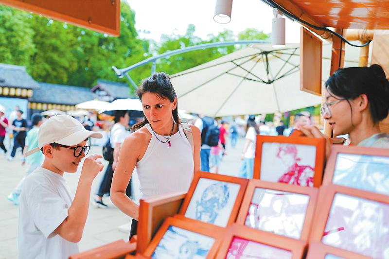 “五一”假期,境外游客在成都武侯祠博物馆主办的“蜀汉百景集”上观赏剪纸艺术。成都武侯祠博物馆供图