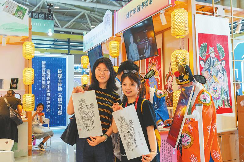 观众与自己在绵竹年画博物馆展台亲手拓印的年画合影留念。