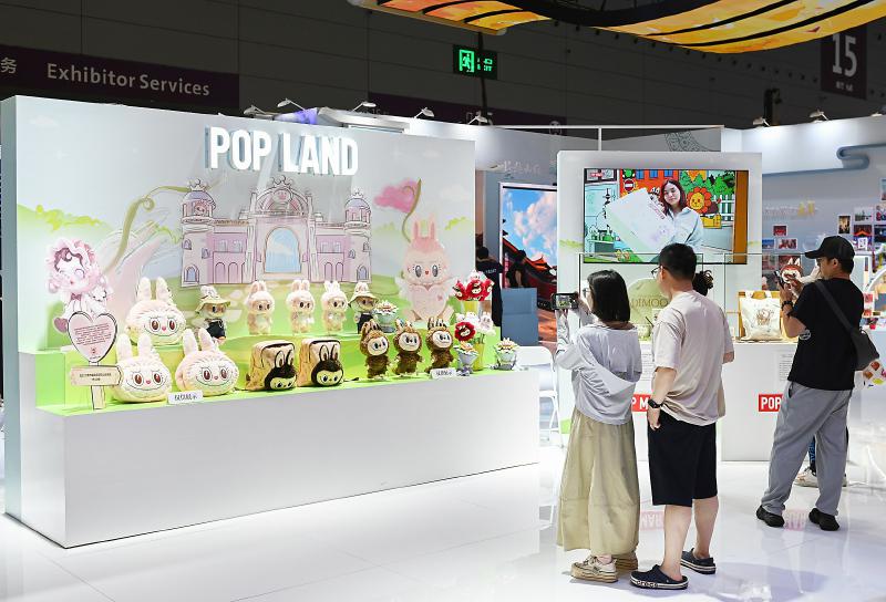 在文博会北京展区,观众在泡泡玛特城市乐园展台前拍照。新华社记者 肖恩楠 摄